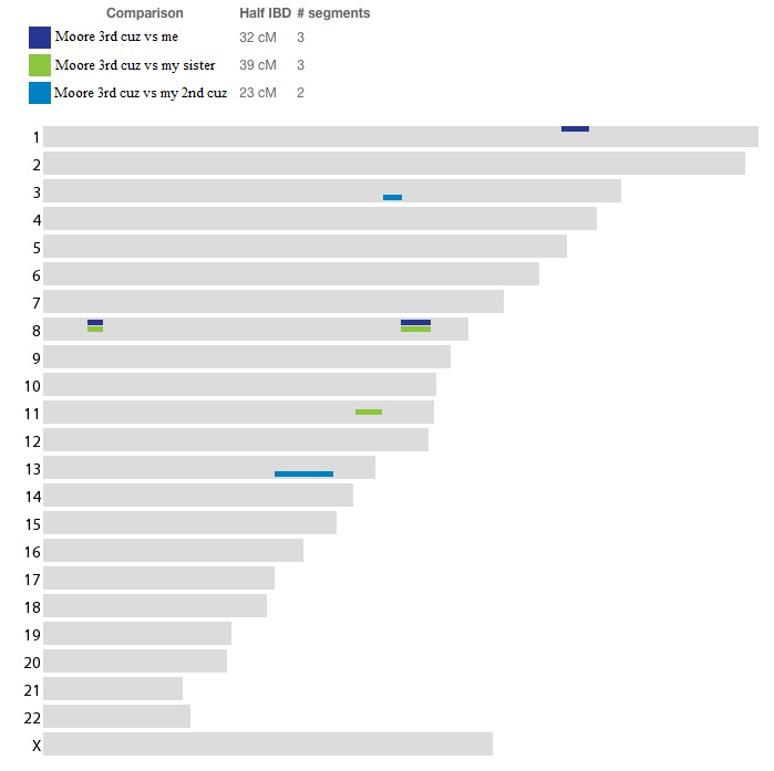 Next, we can see that our second cousin (also a third cousin to this newly discovered Moore cousin) inherited completely different DNA from our shared 2nd great grandparents than my sister and I. Also, she only has two segments in common with him (light blue), but one is larger than any of those my sisters and I share with him. Her overall sharing is lower at only 23 cM versus 32 cM for me and 39 cM for my sister. She is more in line with my other sister (not shown here) who only shares two segments and 22 cM with this cousin.