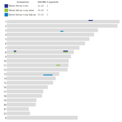 As I have explained before, I tested my father's siblings since he is deceased, hoping to be able to use them as a proxy for his DNA. Since siblings only share an average of 50% of the DNA, you can see this plan does not always work out. My uncle (dark blue) shares almost completely different DNA with this cousin than my sister and I do. The only commonality with this "new" Moore cousin lies on Chromosome 11 between my uncle and sister (illustrated by light blue and dark blue bars).