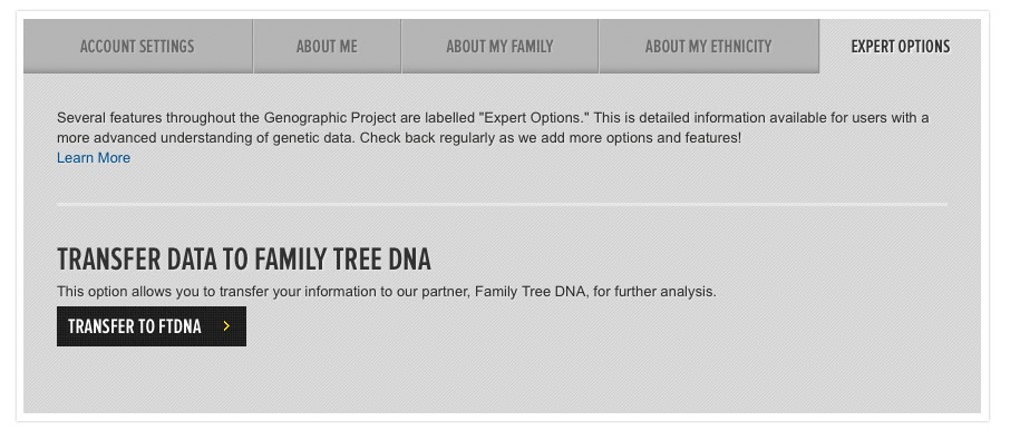 To transfer your results to Family Tree DNA, go to the Profile tab and then Expert Options: